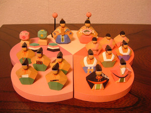 ようやくお雛様を出した。「るるぶ」に載っていた写真にほれ込んで、こんぴら歌舞伎を観にいった年に伊予松山の工房まで出かけて手に入れた逸品。台座の桃の花も全部ピースで自由に組み合わせることができる。もっと早く出してあげればよかったなぁ。