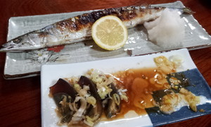 2件めのお店で焼いてもらったサンマが美味しかったぁ♪ (サンマの下はピータン)