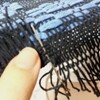 ピンクのは、経糸の両端を3本ずつ房結びにするいつもどおりの方法で仕上げた。ライトブルーのはまだ仕上げ前。そしてオレンジのは、経糸の端を1本ずつ毛糸針に通して、織地の端の黒い部分に織り込んでいく方法を取り、125本もあるので片側だけ終えたところで力尽きてしまった。ライトブルーのも同じ方法で仕上げるとすると、125本×3=375本かぁ。気が遠くなるわぁ。